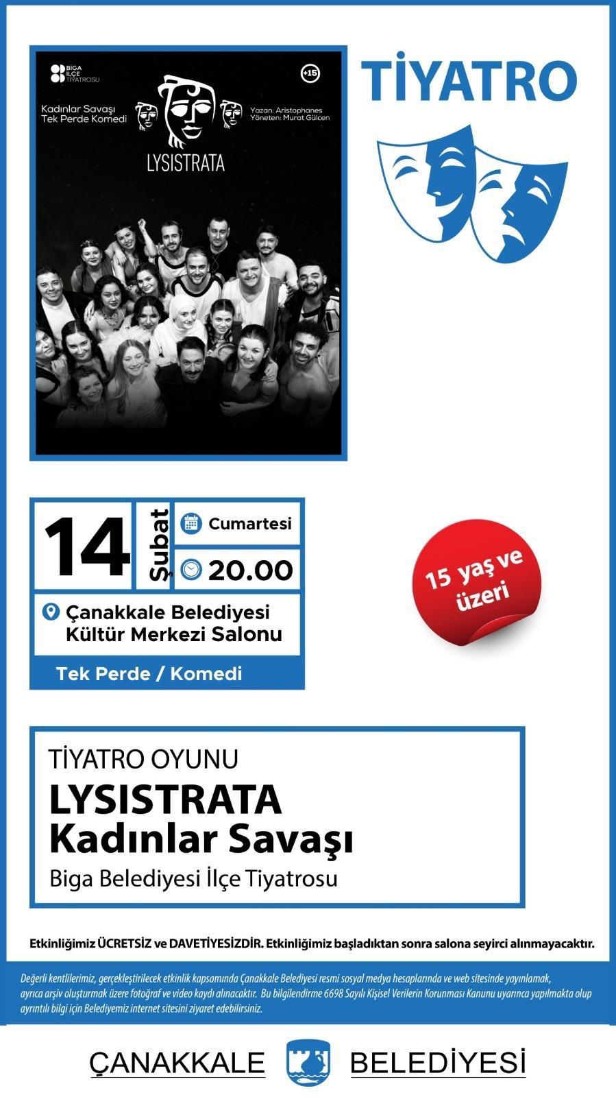 Biga Belediyesi İlçe Tiyatrosu, 2500 yıllık barış çığlığı olan "Lysistrata-Kadınlar Savaşı" oyununu 14 Şubat Cumartesi günü Çanakkale Belediyesi Kültür Merkezinde sahneye koyuyor. Biga Belediyesi bünyesinde sanatsal faaliyetlerini sürdüren İlçe Tiyatrosu, büyük bir prodüksiyonla Çanakkale merkezde izleyici karşısına çıkmaya hazırlanıyor. Aristophanes’in ölümsüz eseri "Lysistrata-Kadınlar Savaşı", Murat Gülcen yönetmenliğinde, savaşın yıkıcılığına karşı kadınların başlattığı barış mücadelesini mizahi ve düşündürücü bir dille ele alıyor. ANTİK ÇAĞDAN GÜNÜMÜZE BARIŞ MESAJI Yazar Aristophanes tarafından yaklaşık 2500 yıl önce, Yunan Şehir Devletleri arasındaki bitmek bilmez Pelephoes Savaşlarının yarattığı ağır tahribat döneminde kaleme alınan oyun, tarihin ilk komedyalarından biri olma özelliğini taşıyor. Kadın dayanışması, savaş karşıtlığı ve temel insan hakları temalarını işleyen eser, aradan geçen binlerce yıla rağmen evrensel mesajlarıyla güncelliğini korumaya devam ediyor. GİRİŞLER ÜCRETSİZ VE DAVETİYESİZ OLACAK Çanakkale Belediyesi Kültür Merkezi Salonunda gerçekleştirilecek olan gösterim, 14 Şubat Cumartesi günü saat 20.00’de başlayacak. Sanatın geniş kitlelere ulaşması amacıyla etkinlik tamamen ücretsiz ve davetiyesiz olarak düzenleniyor. Tek perdelik komedi türündeki oyun, 15 yaş ve üzeri izleyici kitlesine hitap ediyor. Organizasyon yetkilileri, oyunun akışının bozulmaması adına başlama saatinden sonra salona kesinlikle seyirci alınmayacağını önemle belirtti.